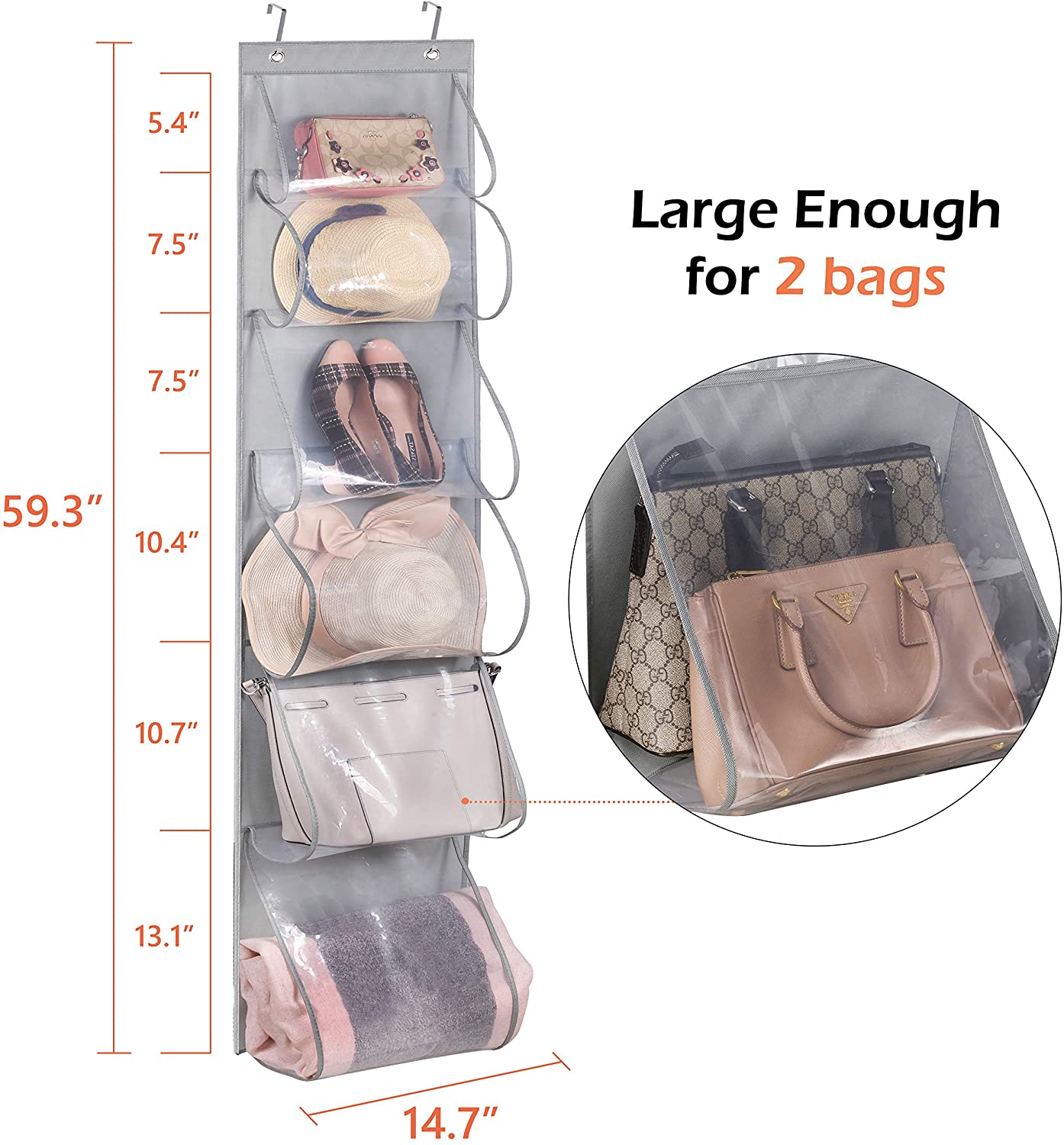 - Versatile purse holder for closets: hanging the towel storage on the door for handbags, shoes, in the closet for hats, scarves clothes, in the bathroom for towels and so on.