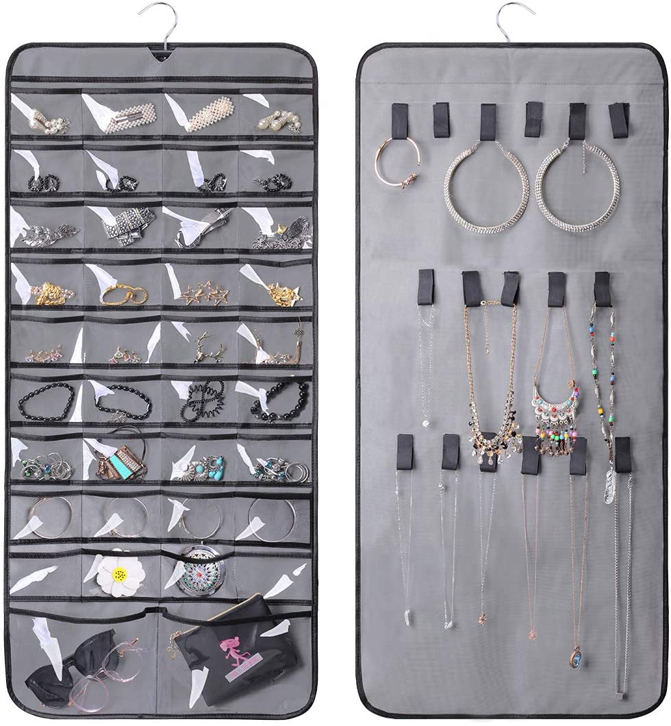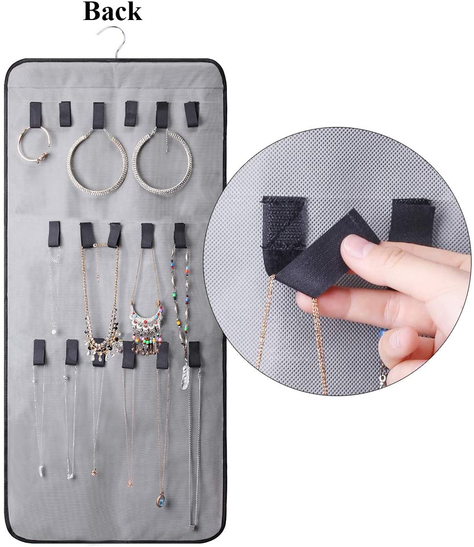 - Breathable sturdy fabric material: You can fold or roll it up by unsnapping the hanger, and 17 tabs filled with heavy statement necklaces and can not seeing any issues;