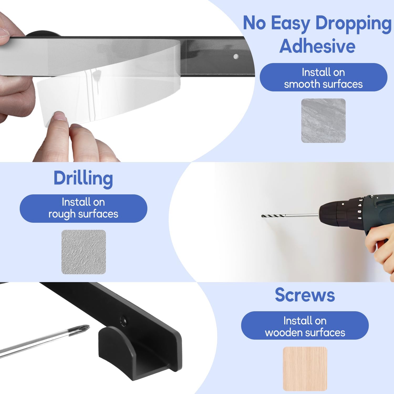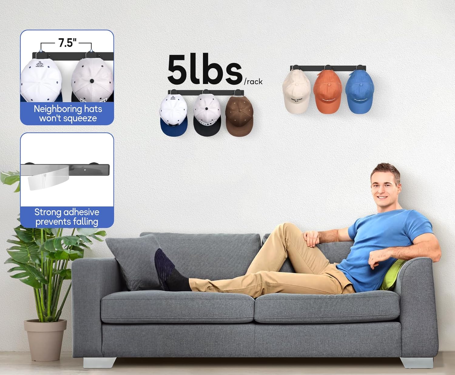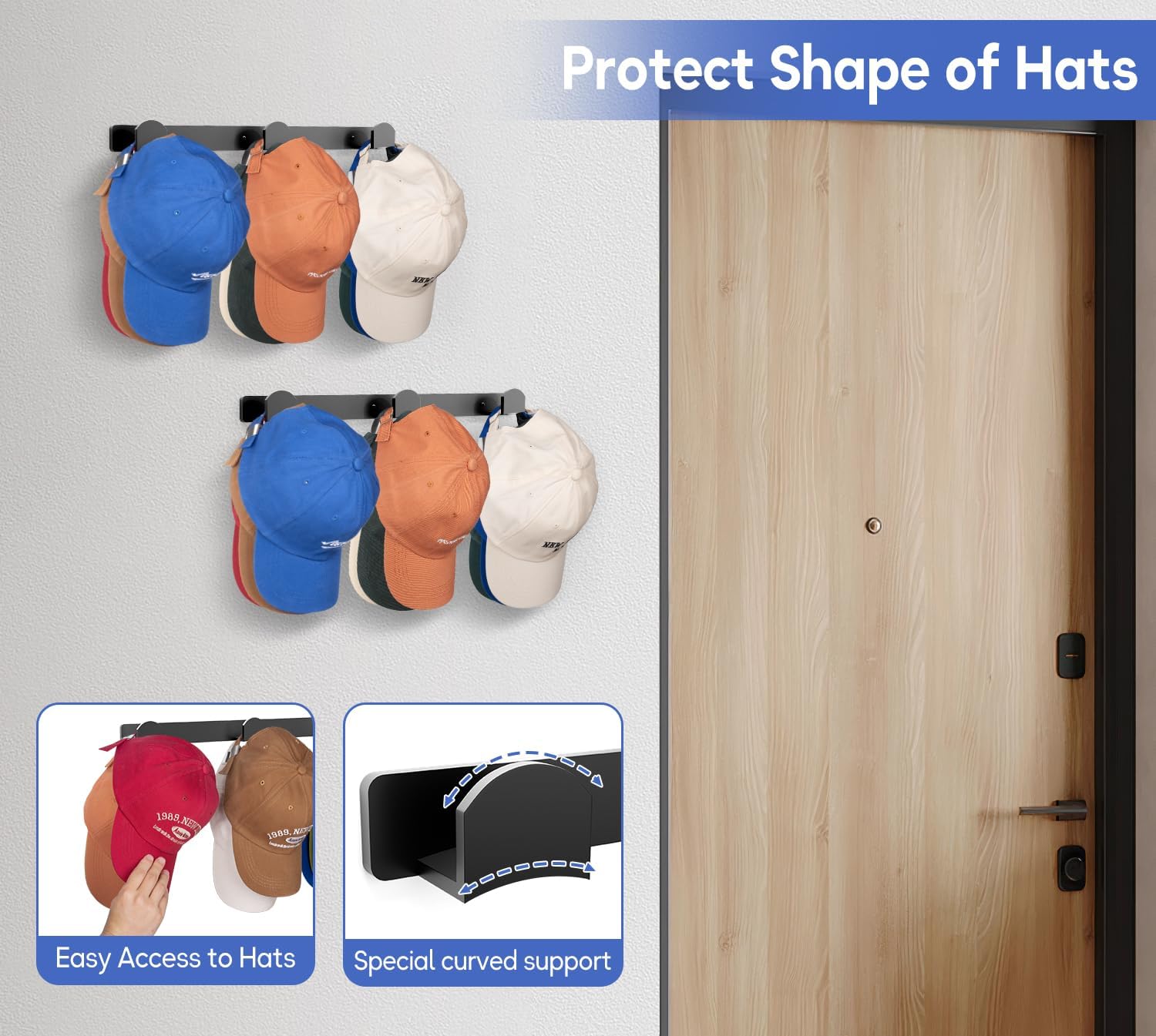 - No-Hole Adhesive Installation: Hat hangers for wall have sturdy construction and strong adhesive backing, providing great weight bearing and ensuring hat rack won't easily fall off the wall. Hat display wall mount can also be hung on rough surfaces with drilling and screwed to wooden surfaces