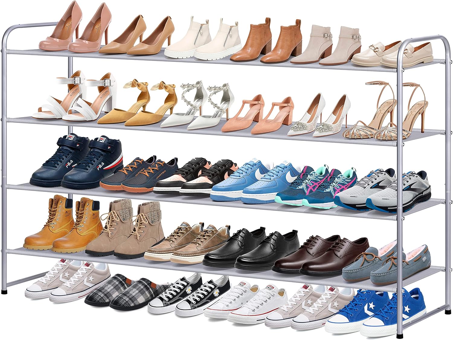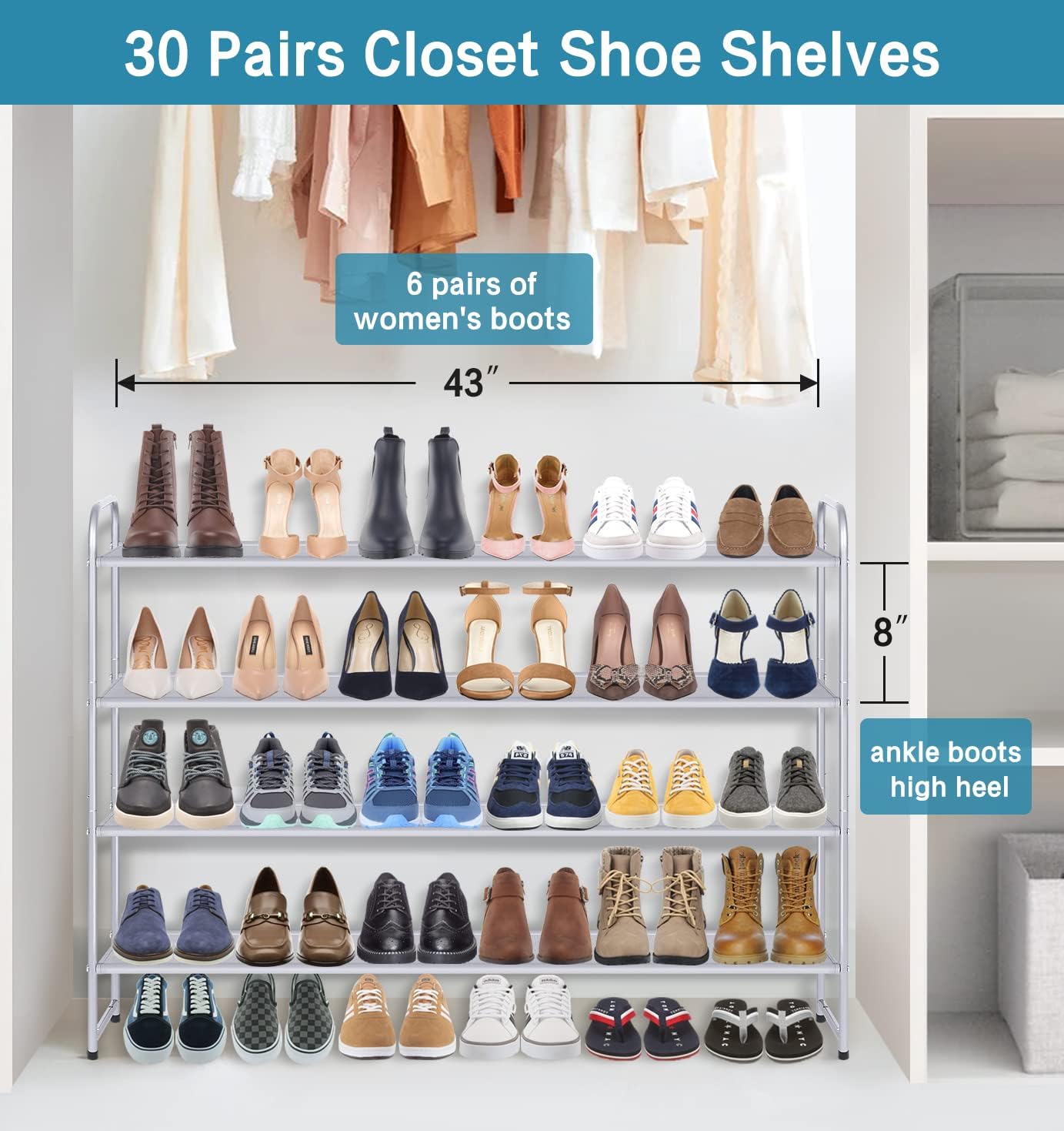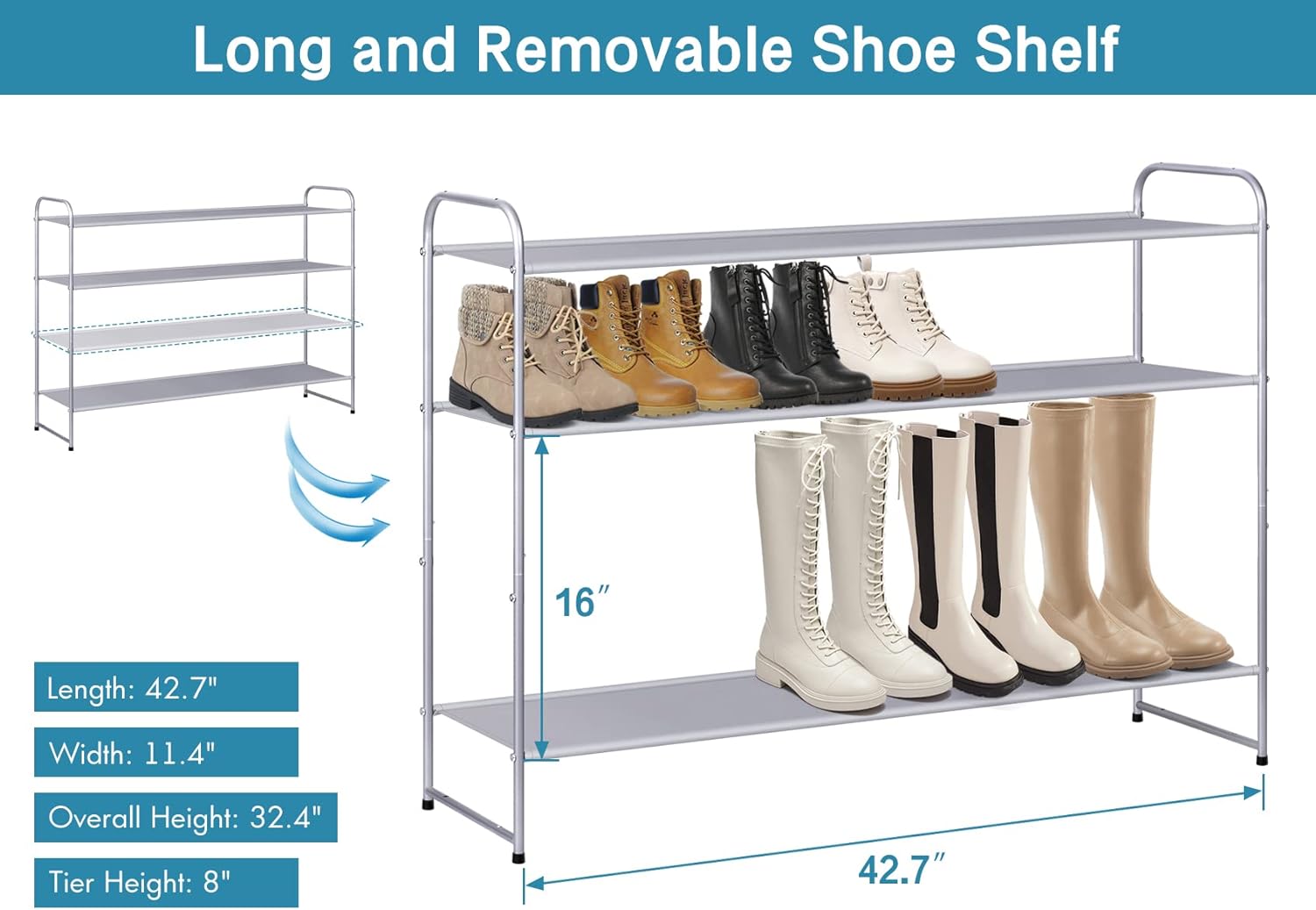 【Long Shoe Rack】Each shoe shelves can hold up 6 pairs of women's ankle boots, or 5 pairs of men's big size shoes,or 9 pairs of kids shoes, the space between shelves is 8", enough to fit adult martin boots, high tops.