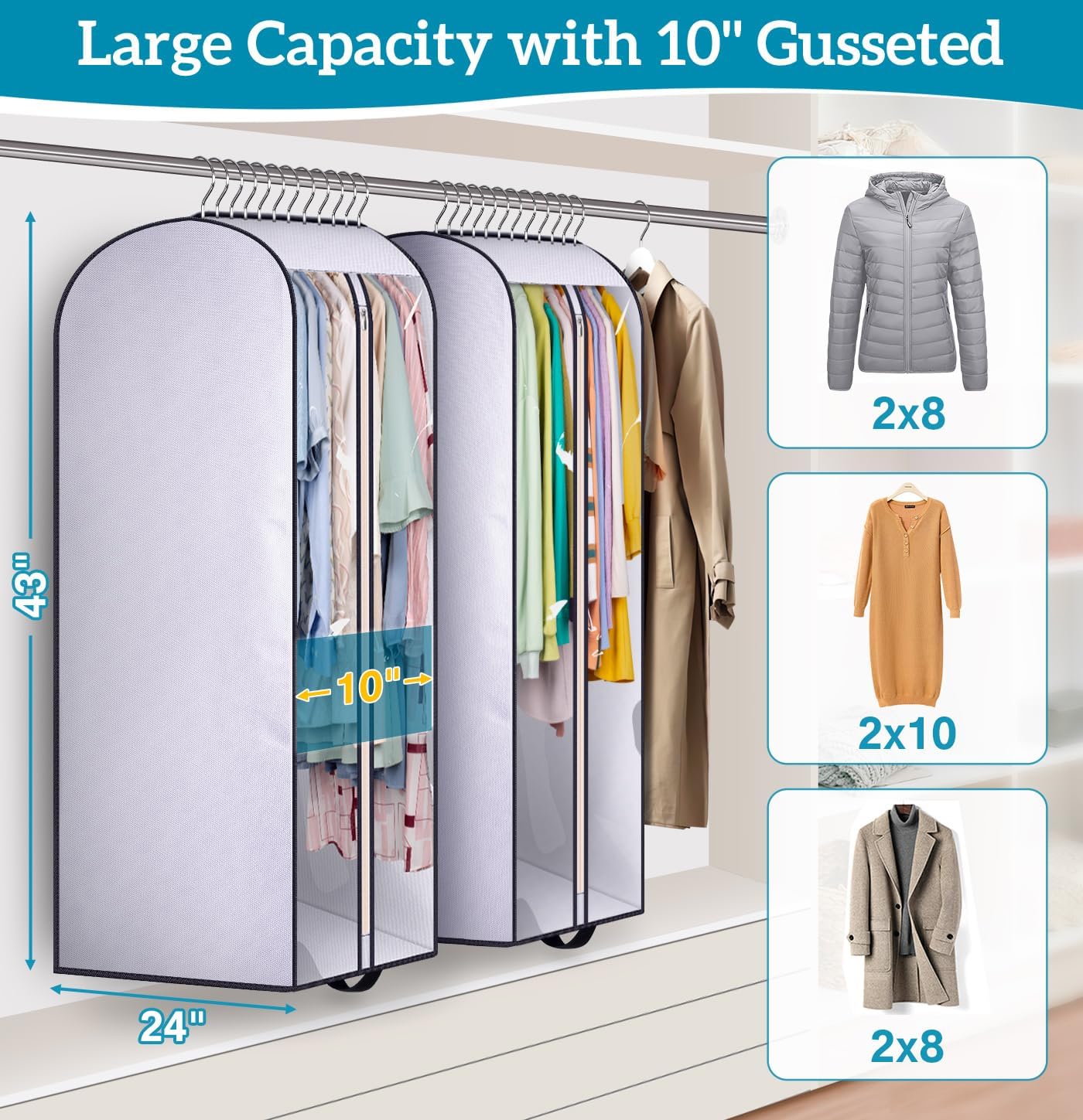 KIMBORA 43" Clear Garment Bags for Hanging Clothes Storage with 10" Gusseted White (2 Packs)