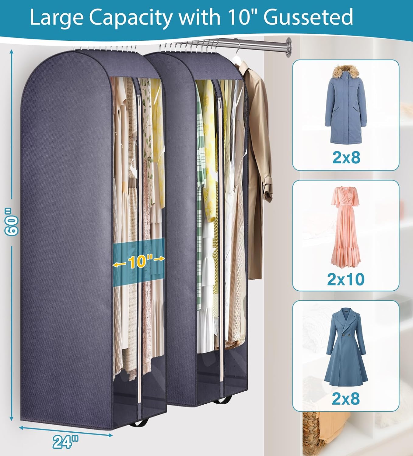 KIMBORA 60" Clear Garment Bags for Hanging Clothes Storage with 10" Gusseted Grey (2 Packs)
