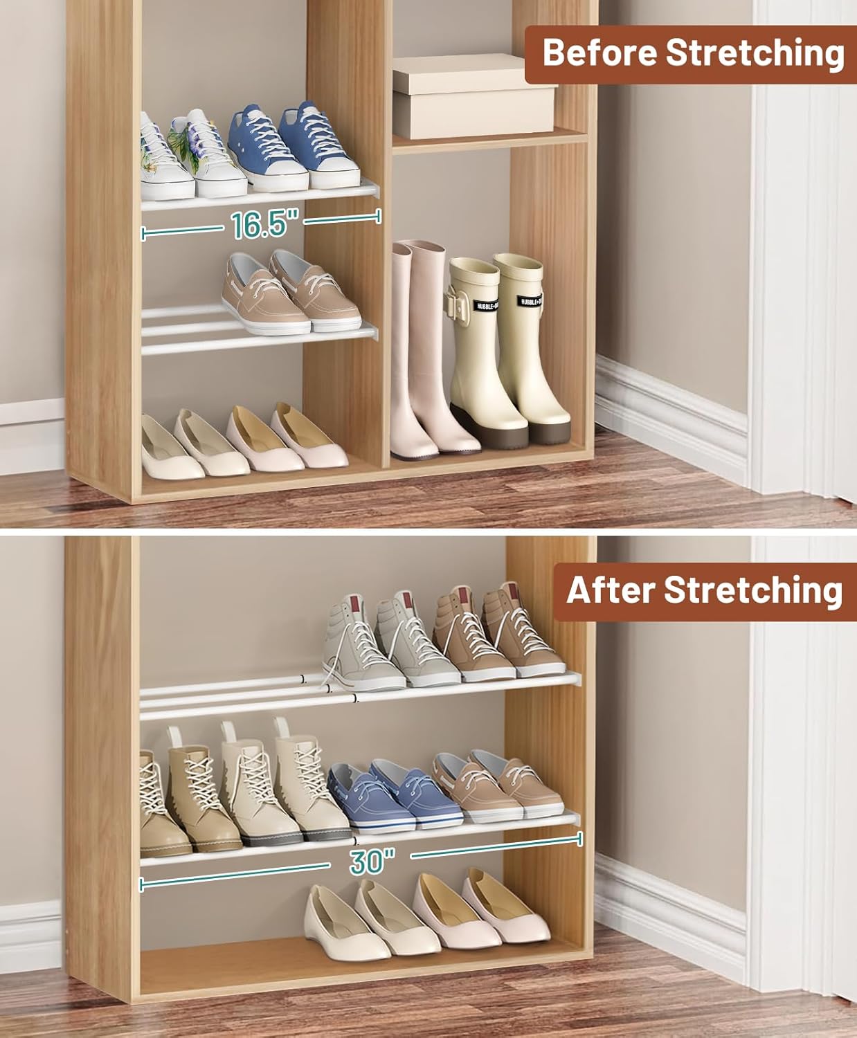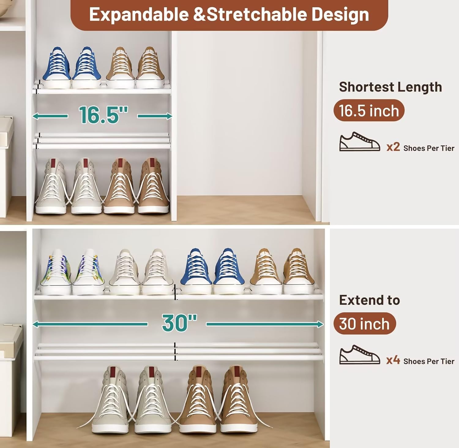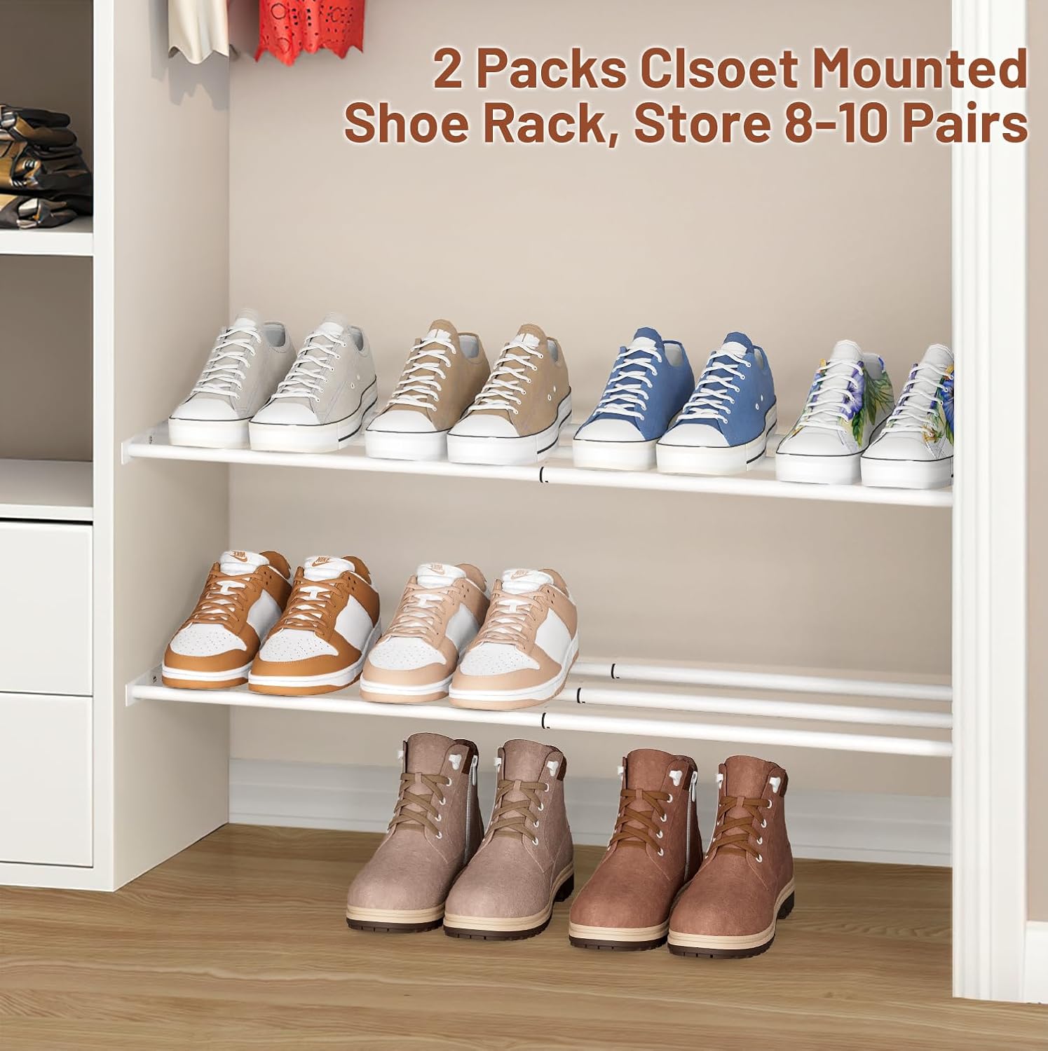 - 【Maximized Vertical Closet Space】: You can make full use of vertical small space with this shoe shelves, divide layers creates two rows of extra space for closet, Not only it can be used as closet shoe rack to store kinds of shoes, shoe box, but also metal shoe rack can be installed at the top of closet as clothes shelves to put clothes, bags, scarves, belts, and so on;