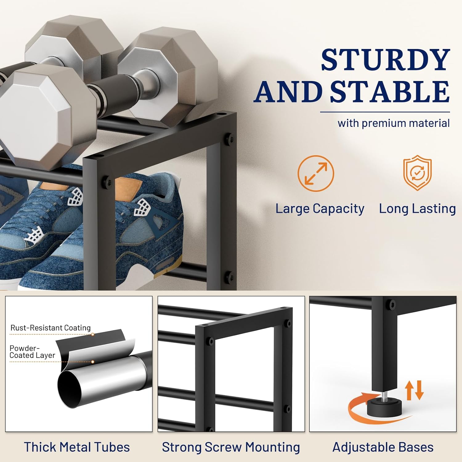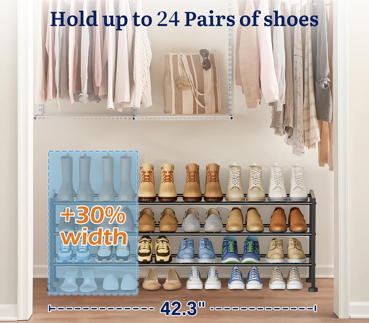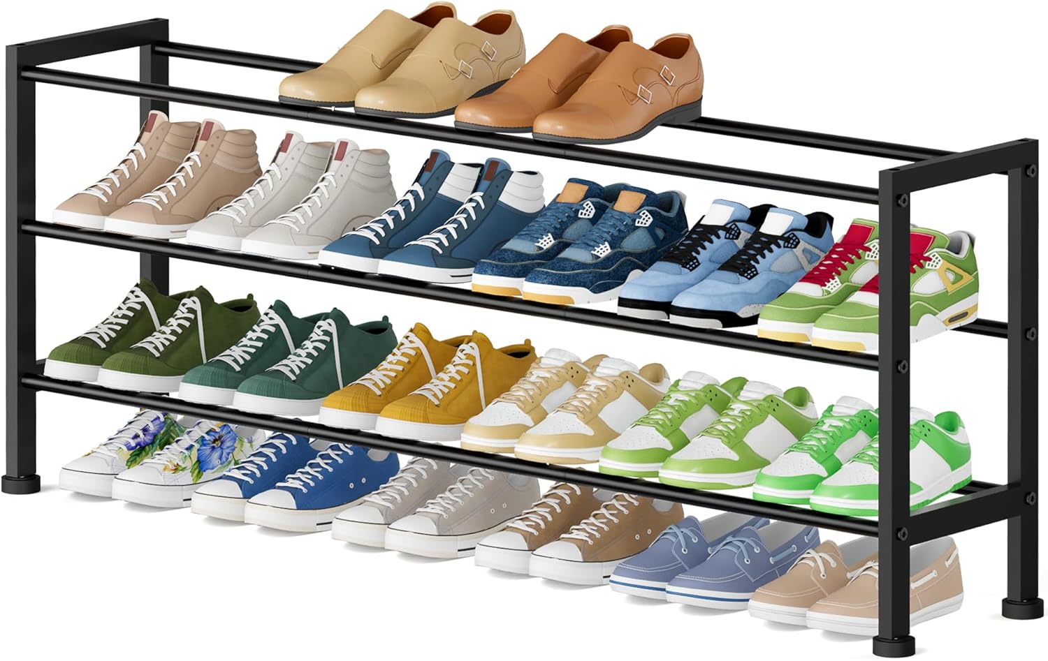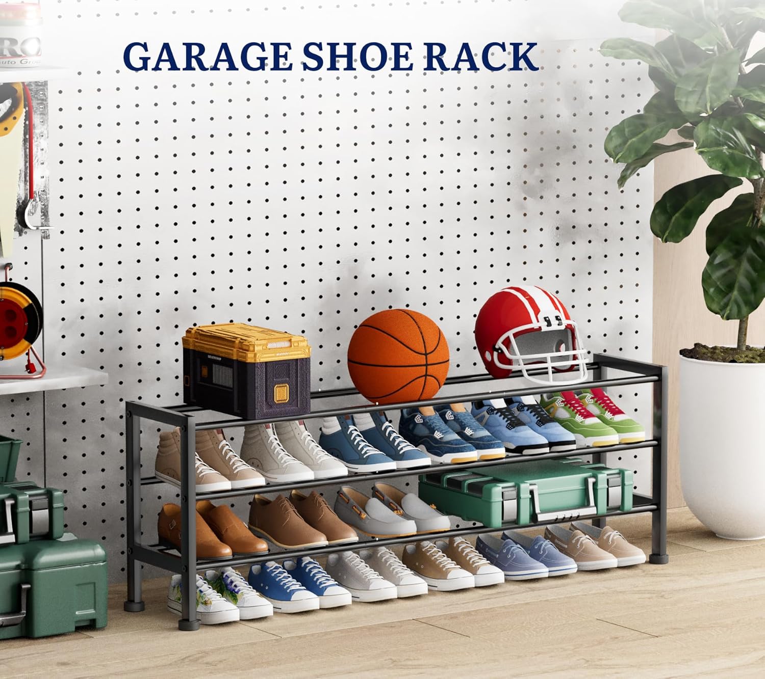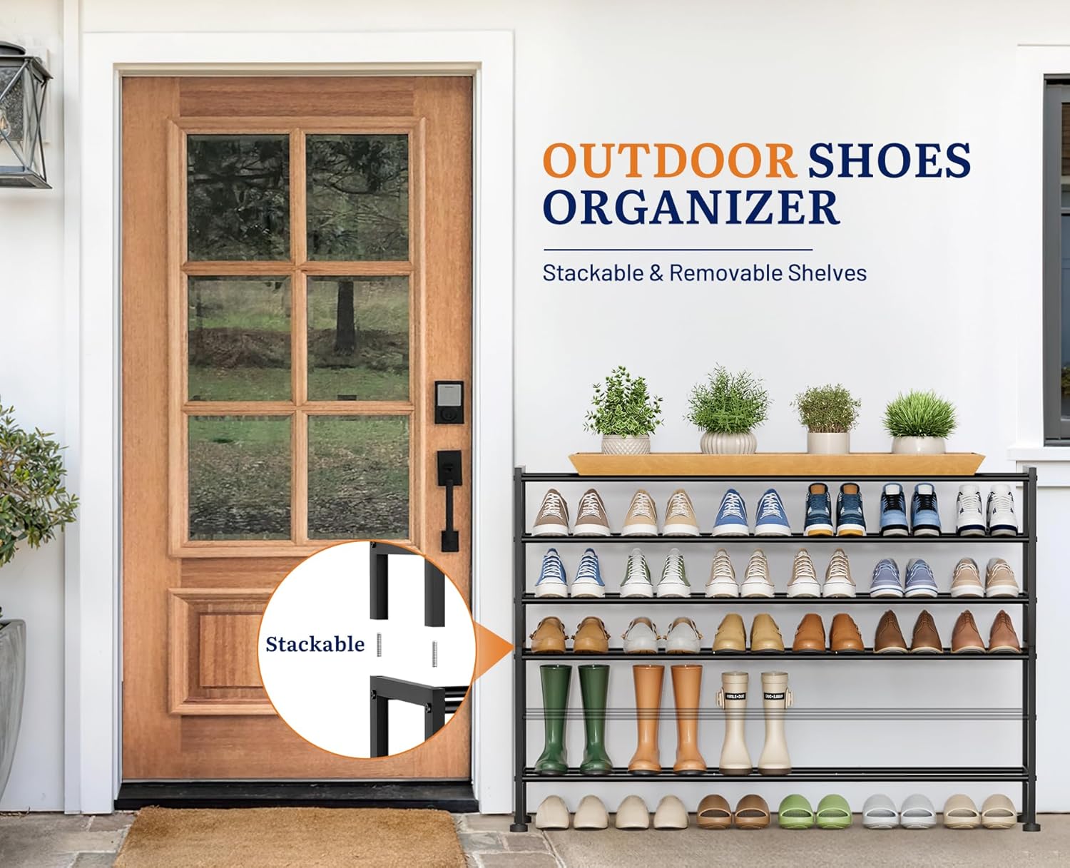 - Stackable As You Wish: You can customize the shoe rack for garage to make the most of the available space. Remove a tier of closet shoe rack for taller boots or pile two stackable shoe rack together for 42 pairs of shoes. The outdoor shoe rack won't sway on uneven flooring thanks to its four adjustable feet